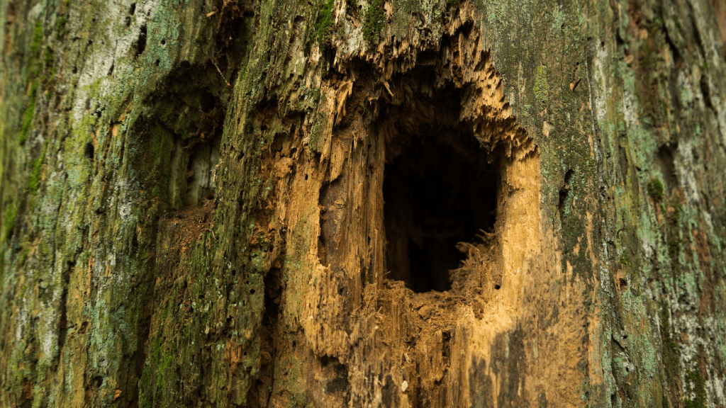 The tree’s bark is whole. But inside it rots away. Surprise! It falls down.